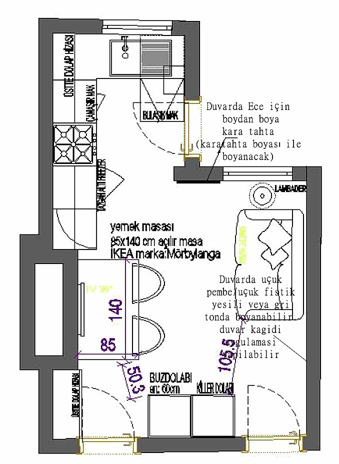 TasarlaYolla Ekibi tarafından hazırlanan, proje süreci boyunca danışanın talepleri doğrultusunda şekillenen final tasarımının cephe görünüşleridir. Mekanın iç cephelerindeki mobilya, aydınlatma elemanları, aksesuar benzeri objelerin yerleşimi 2 boyutlu olarak gösterilir.